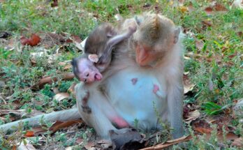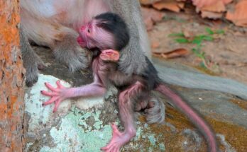 In the quiet corner of a lush forest clearing, a small baby monkey clung softly to its mother’s fur, holding on with tiny hands that trembled with both need and …