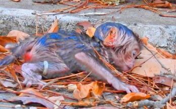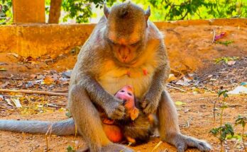 Under the gray morning sky, a tiny newborn baby monkey lay trembling on the cold ground, its soft fur still damp from birth. The fragile infant, barely able to lift …