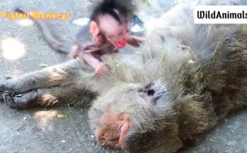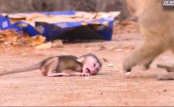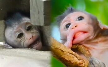 Tiny baby monkey Matin looked heartbroken today. With big round eyes full of confusion, he sat all alone on the ground, gently trembling. His small hands clutched a piece of …
