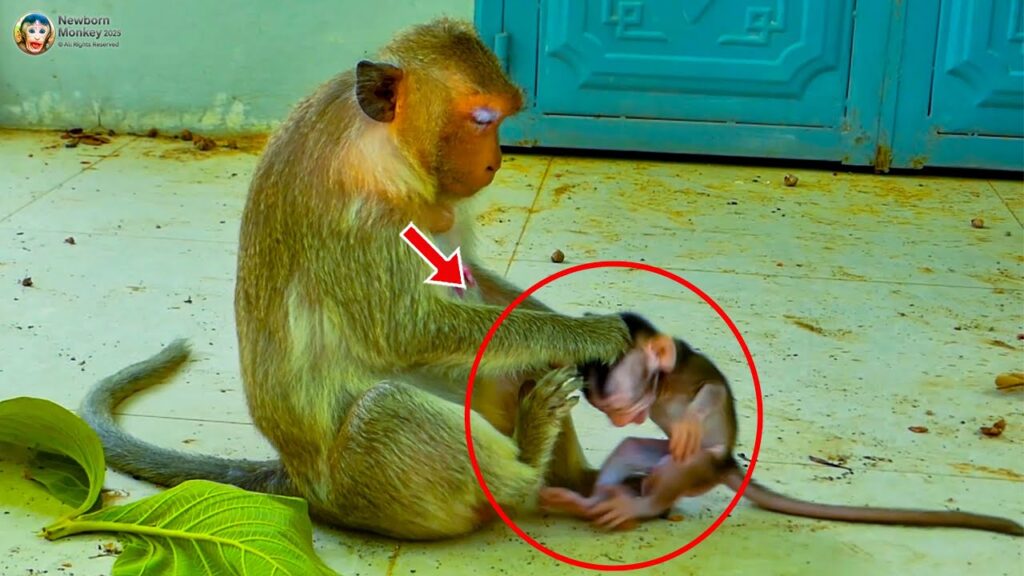 In the quiet forest, a tender yet emotional scene unfolds between a mother monkey and her little newborn. The baby, still fragile and learning about the world, clings tightly to its mother’s belly, searching desperately for comfort and nourishment. Its tiny cries echo softly, a natural signal of hunger and need. With innocent eyes, the baby presses close, trying to find the warmth of milk that would ease its tiny body’s struggle.