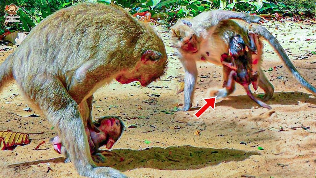 Under the golden morning sun, tiny baby Masha sat quietly on a broken branch, her thin arms wrapped around her frail body. Her eyes, wide and full of innocence, searched for warmth in her mother’s familiar face. But today, something was different. Mom Lana, usually gentle and protective, seemed distant—her eyes cold, her movements harsh.