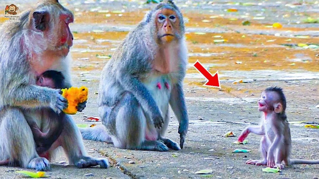 In the quiet morning light, the troop gathered around the temple steps. Little Miko, a playful and innocent baby monkey, was hopping near the crowd, trying to find his mother after playtime. His soft eyes were filled with joy and curiosity—until something unexpected happened. Another mother monkey, known to be short-tempered and protective of her own baby, suddenly pushed Miko away harshly when he came too close.
