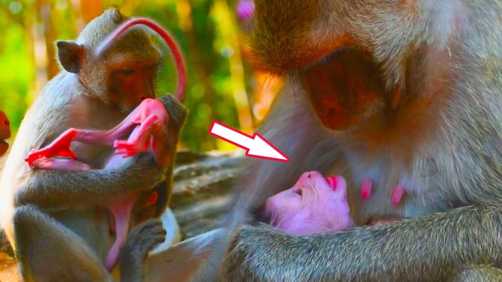 In the quiet corner of the forest, under the shade of a large fig tree, a beautiful moment unfolded between a devoted monkey mother and her tiny newborn baby. The little one, only hours old, lay curled on a bed of soft leaves, its delicate fur still damp from birth. The mother, wide-eyed and gentle, leaned in close, her hands trembling slightly as she tried to examine her baby with tender care.