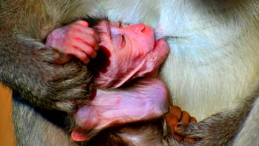 Once satisfied that her newborn is safe and clean, mum shifts her position and pulls the tiny one close to her chest. The baby instinctively searches for milk, its tiny mouth opening and nuzzling against her. With a soft, patient posture, she offers her breast, allowing the little one to latch on.