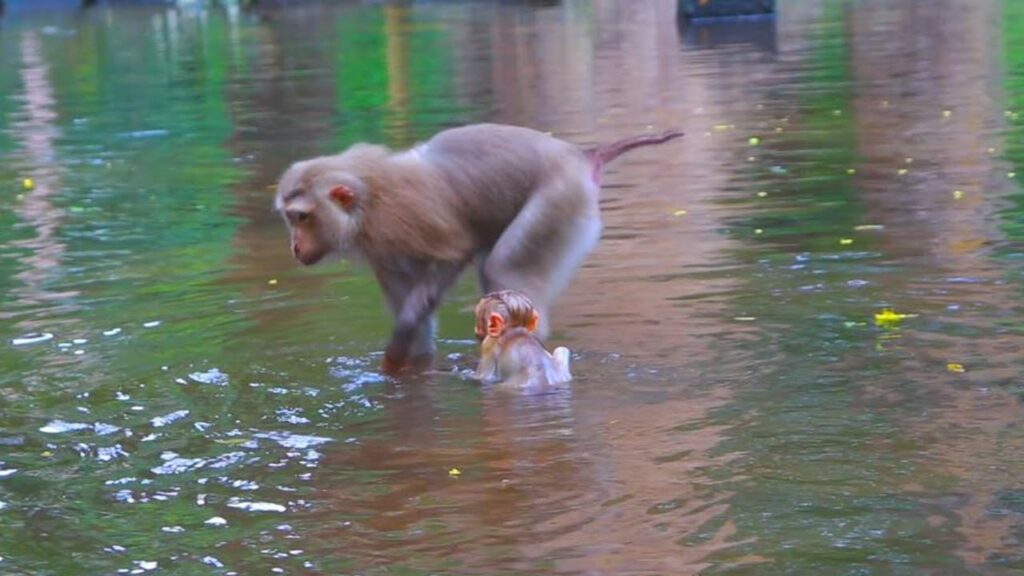 The gentle warmth of the afternoon sun shimmered across the calm water as little Jacee, the curious baby monkey, clung tightly to his mother. His eyes were wide, half anxious and half eager, as he looked down at the rippling surface. It was time for his swimming lesson, and no teacher could be more patient or loving than his smart mother, Joyce.