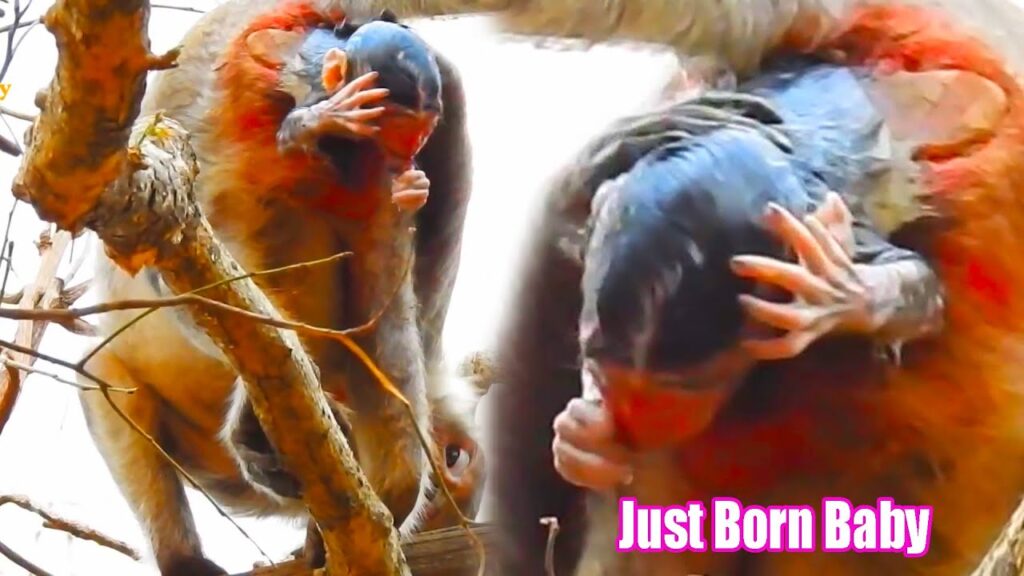 With patience and quiet determination, the mother endured the pain. Every movement showed both struggle and courage. Then, in a moment that felt like magic, new life appeared. The tiny baby monkey emerged, fragile and wet, letting out a soft cry that echoed gently through the branches. It was a sound of survival, of hope.