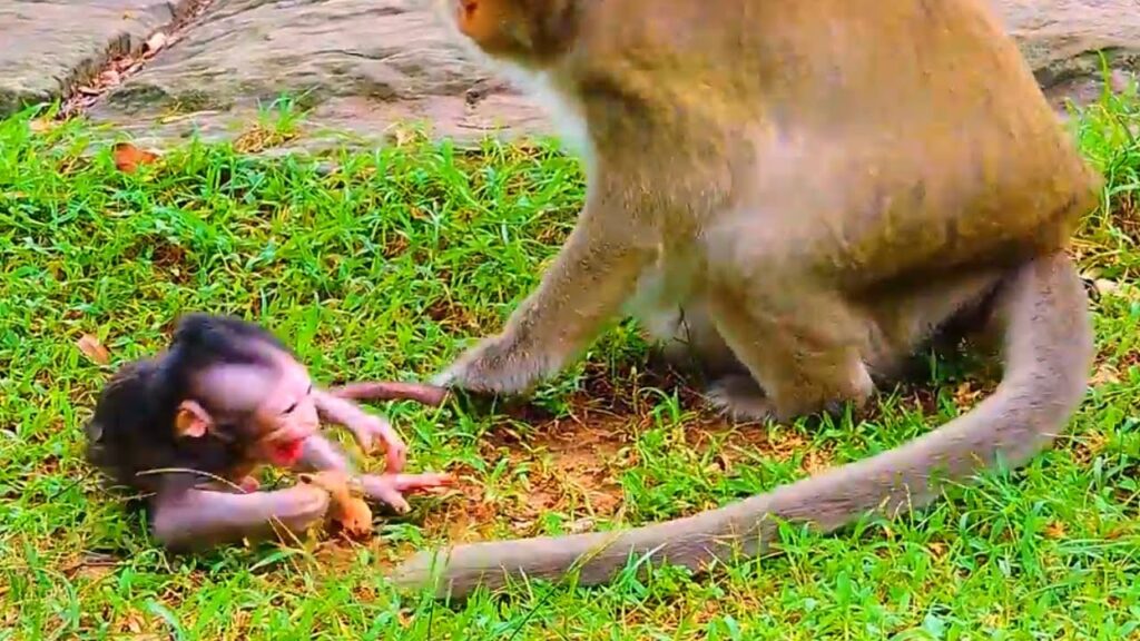In the quiet afternoon of the forest clearing, a small newborn baby monkey lies upon the soft grass, his tiny body trembling with frustration. His voice rises high, filled with a raw and powerful cry that echoes across the trees. The baby’s screams are sharp, carrying both anger and sadness, as if his little heart is overwhelmed with feelings too big for him to understand. His face turns red, eyes squeezed shut, and his tiny fists clench while he kicks the ground in protest.
