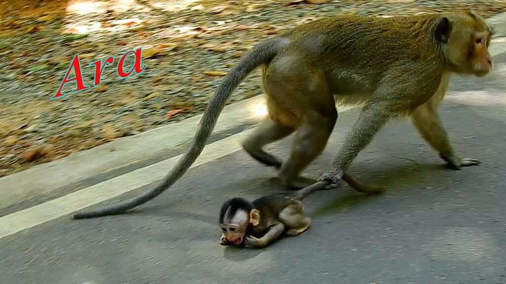 The jungle road was unusually quiet that morning, yet one tiny sound broke the silence—soft, desperate cries from a baby monkey named Ara. Separated from her mother in the confusion of moving through the trees, Ara had stumbled down to the roadside. Her tiny body shook as she sat alone, her cries echoing like a call for help that tugged at any heart passing by.