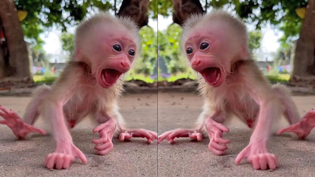 Early in the quiet morning, a tiny baby monkey clung tightly to a tree branch, his cries echoing through the forest. His small voice was full of desperation — he was hungry and cold, and the only thing he wanted was milk from his mother. His little belly rumbled as he reached out with trembling hands, searching for warmth and comfort. The sound of his crying pierced the stillness, grabbing the attention of nearby monkeys.