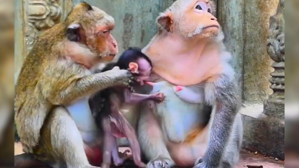 In a quiet forest clearing, the sound of soft footsteps and tiny cries broke the peaceful morning. A tiny baby monkey, no more than a few weeks old, scurried behind his mother with trembling steps. His small belly rumbled with hunger, and his eyes looked up with desperate hope. Each time he reached out and tried to cling to his mother’s side, she gently brushed him away, moving faster, avoiding his little hands.