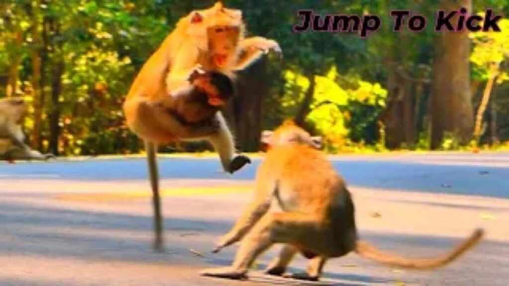 In the wild world of monkeys, not every moment is filled with gentle cuddles or sweet nursing scenes. Sometimes, the reality of survival and discipline looks shocking to human eyes. In this dramatic clip, an angry mother monkey reacts harshly toward her tiny baby, leaving viewers both surprised and heartbroken. The little one, full of energy, tries to play and follow his mother, but instead of receiving attention, he faces unexpected aggression. The mother suddenly jumps and kicks her own child, sending the baby tumbling down onto the ground.