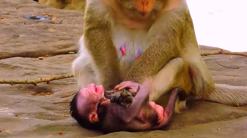 It was a heartbreaking morning in the quiet forest, where soft sunlight touched the leaves but could not warm the pain unfolding beneath the old tree. The oldest mother monkey sat rigidly on a branch, her face tired and hardened by years of survival. Clinging desperately to her belly was her tiny baby, weak, thin, and trembling with hunger. The baby searched again and again for milk, crying softly at first, then louder as hope slowly turned into panic.