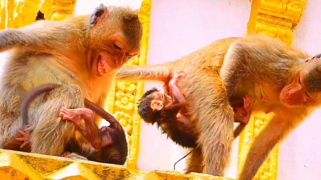 In the quiet corner of the monkey troop, a heartbreaking scene unfolded. A young mother, still inexperienced in the ways of motherhood, seemed torn between her own freedom and the responsibility of her newborn baby. The tiny infant, weak yet full of love, reached out with trembling arms, desperately clinging to the warmth of his mother’s embrace. But instead of pulling the baby closer, the mother tried to push him away, refusing the soft hug that he craved so much.