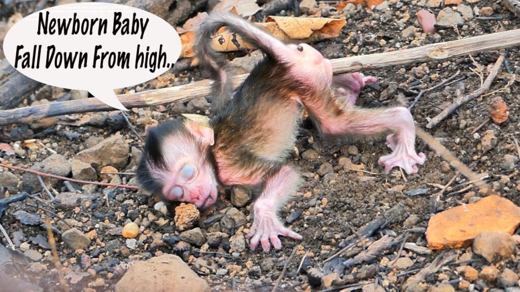 It was a heartbreaking moment when a tiny newborn baby monkey tragically fell from a high tree because of its mother’s carelessness. The little one was still fragile, with soft limbs and a weak grip, barely knowing how to hold on to anything. The mother, distracted and inattentive, jumped from branch to branch, not realizing her baby wasn’t secured tightly to her chest. In a sudden slip, the baby lost its tiny hold and tumbled down, crying loudly as it fell through the leaves and hit the hard ground.