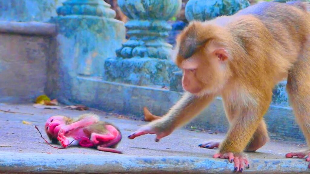 In the quiet corner of the forest, the early morning sun filtered softly through the leaves, casting gentle shadows over a tiny baby monkey who sat alone on a cool rock. The little one, still very young and fragile, curled his small body forward as he let out soft cries, calling for the warm comfort he always expected from his mother. His voice trembled — not loud, but full of longing — hoping that at any moment she would return and gather him into her arms.