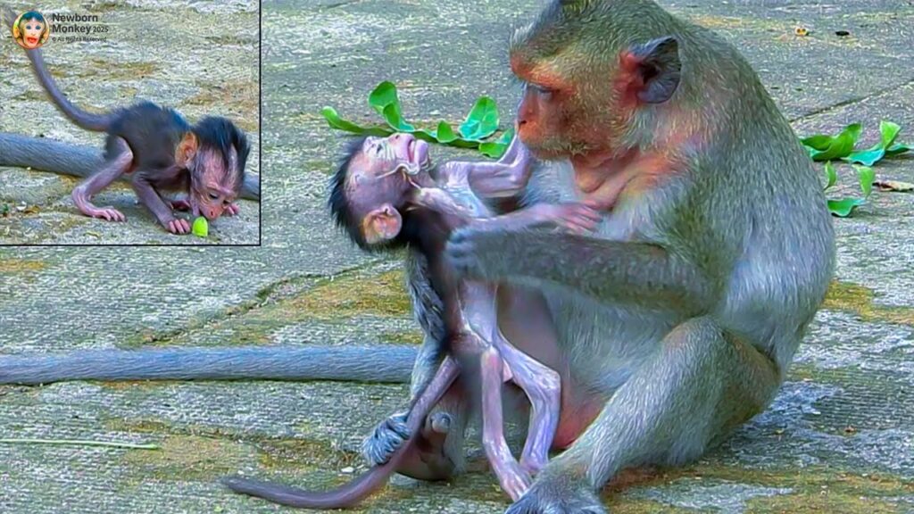 In a heartwarming yet puzzling moment, mother monkey Messi gently cupped her baby’s tiny face, peering closely into his mouth with deep concern. She had just returned from foraging and expected to see her baby chewing happily, perhaps munching on some fruit or a leaf she had left nearby. But to her surprise, the little one sat there with a blank expression, his mouth completely empty.