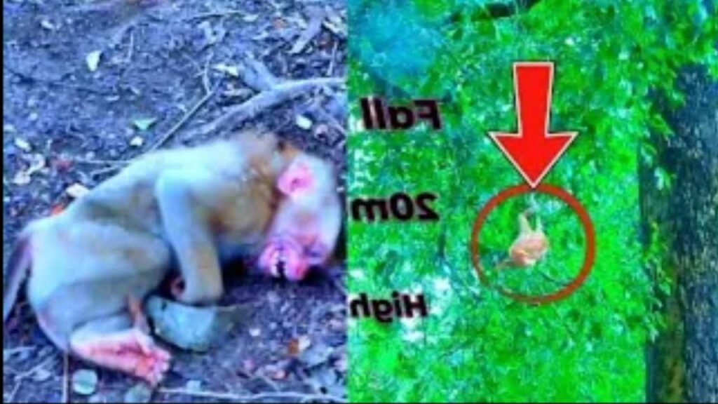 In the jungle, the branches sway and dance with the wind, creating a dangerous playground for little monkeys. Among them, one tiny baby monkey dared to climb too high, chasing after a leaf fluttering in the air. At first, it seemed like nothing unusual. Monkeys climb trees every day, and this one was just following its natural instinct. But suddenly, the little one lost its grip on the slippery bark. The world turned upside down as the baby dropped down from the very high tree, and for a moment, it seemed like his life would end suddenly.