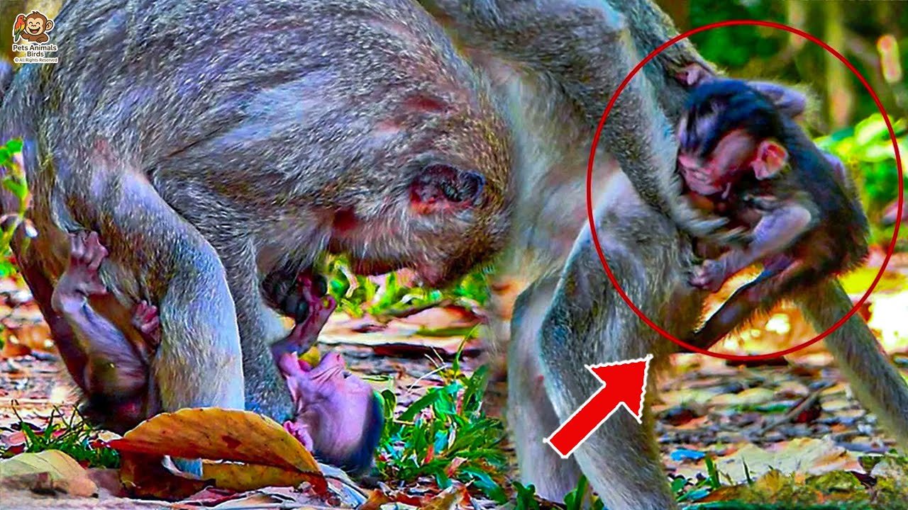 In a quiet corner of the troop’s resting area, a tiny baby monkey lay close to his mother, his small body trembling with soft, pitiful cries. The morning sun warmed the ground, but the baby’s heart felt cold with confusion and hunger. He reached out with his fragile hands, trying to pull at his mother’s fur, hoping she would allow him to nurse again. But the mother turned away, gently pushing him aside. It was a heartbreaking moment that revealed the tough lessons of the wild.