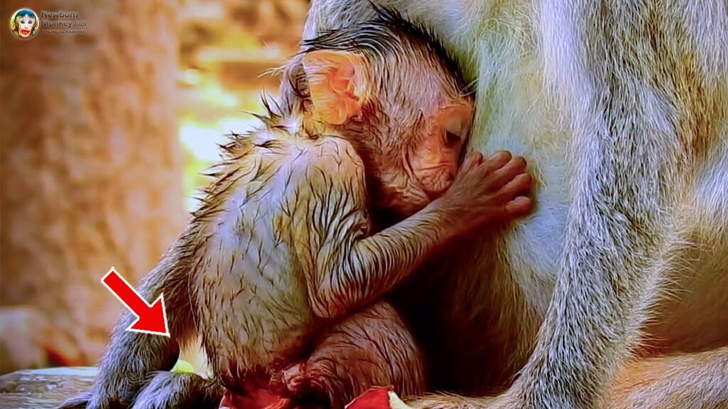 In the quiet shade of the forest, a small baby monkey whimpered softly, holding onto his tiny leg where a scratch had formed after a careless fall from a low branch. The injury wasn’t severe, but for a newborn so fragile, even a small wound felt like the world had collapsed. His wide eyes reflected fear and pain as he struggled to understand what had just happened.