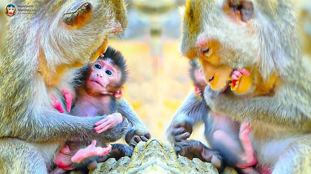 In the quiet corner of the troop’s resting place, Mom Sippey sat with her tiny newborn cradled in her arms. The baby, still learning the rhythms of life, squirmed uncertainly as it tried to find comfort. Nursing was a new experience for the little one, and at first, it struggled, moving its head clumsily and letting out faint cries. But Sippey, calm and patient, knew exactly how to guide her baby.