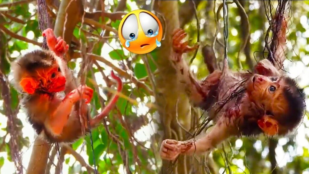 High in the branches of a tall tree, an exhausted mother monkey sat quietly, her body slumped and her eyes heavy with fatigue. For days, she had carried her tiny baby everywhere—searching for food, avoiding danger, and protecting the little one from the harsh world around them. Hunger, stress, and weakness slowly drained her strength. In that painful moment, she made a heartbreaking choice and moved away, leaving her baby clinging alone to the tree.