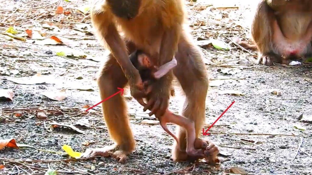 In the heart of the wild, a touching scene unfolds that reminds us how fragile yet determined newborn life can be. A tiny baby, still so new to the world, clings tightly to his mother. His little arms are weak, his fingers trembling, but the will to stay close is strong. As the mother moves carefully, stepping over uneven ground, the baby senses danger. He tries with all his small strength to catch her, holding on to prevent himself from falling.