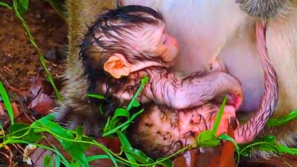The moment of birth is always a delicate and precious time, not only for humans but also for animals in the wild. A newborn baby monkey, just entering the world, is fragile and completely dependent on the care of its mother. In this heartbreaking scene, the tiny baby has just been born, its body still wet and trembling from the process of birth. Instead of immediately lifting her infant into her arms for warmth and safety, the mother leaves the baby on the cold ground.