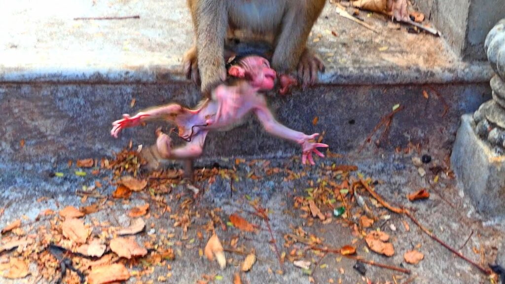 In the peaceful forest, the sound of leaves rustled gently in the breeze—until a heartbreaking scene unfolded. A newborn baby monkey, soft and fragile, clung to his mother’s belly, eyes still adjusting to the bright world. His small hands reached for warmth and safety. But suddenly, something unexpected happened.