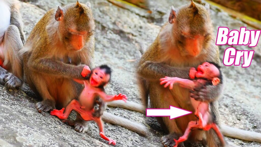 While the mother monkey was climbing a tall branch, her grip loosened for just a second. The tiny baby monkey dangled dangerously in the air, slipping halfway from her arms. A sharp, heart-wrenching cry echoed through the trees. The baby’s little hands reached out in panic, eyes wide with fear. That cry—so loud, so full of desperation—seemed to stop time itself.