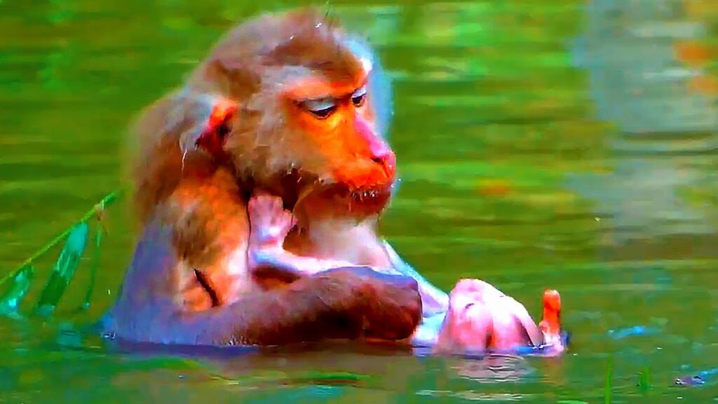 With each gentle step, Libby lowered herself into the cool water, keeping Lily’s little head above the surface. Baby Lily blinked at the strange, shimmering world around her, her small hands instinctively clinging to her mom’s fur. She couldn’t breathe underwater, of course, but Libby knew how to keep her perfectly safe, lifting her higher whenever the waves lapped a little too close.
