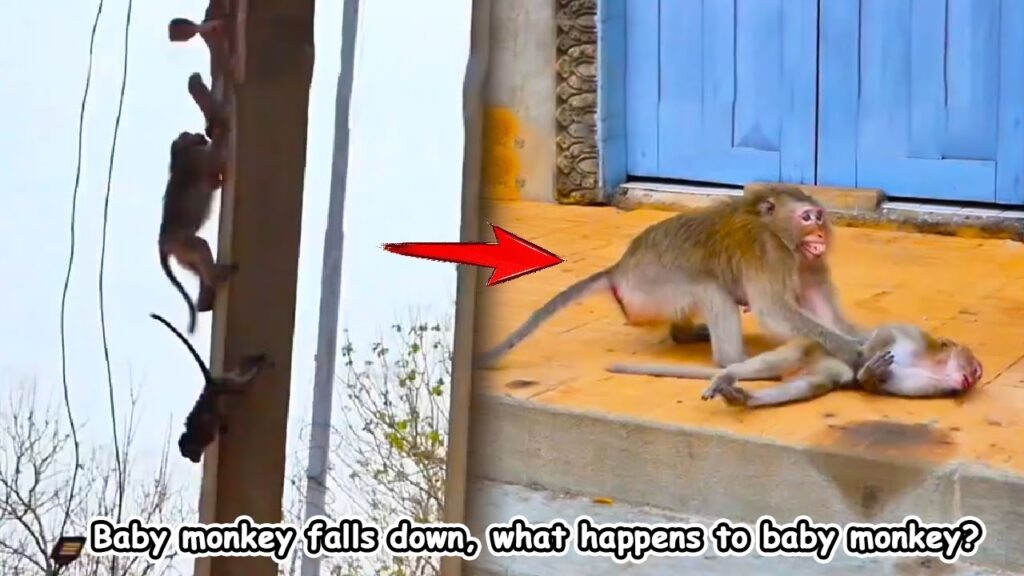 A quiet morning in the jungle suddenly turned tense when a tiny baby monkey slipped from a high tree branch. The playful baby had been climbing just a little too far from its mother, full of curiosity and excitement. In one quick moment, its tiny hands lost grip—and the little one tumbled down through the branches, landing with a thud on the ground below.