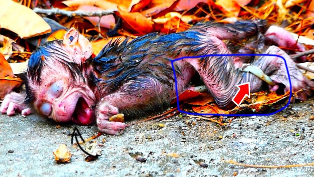 In the quiet shadows of the jungle, a tiny cry echoed through the leaves—a newborn baby monkey, no more than a few hours old, had been left alone. His pink, fragile body lay on the cold ground, still wet from birth, eyes tightly shut as he let out desperate, heartbreaking cries for his mother. There was no warm embrace, no gentle grooming, no comforting heartbeat. The jungle around him was alive, but he was utterly alone.