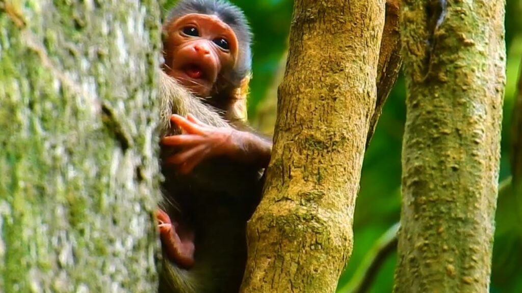 In the quiet shade of the forest, a tiny baby monkey sat alone, trembling with fear and confusion. The little one had been exploring just a little too far from the safety of his mother’s arms. Suddenly, he slipped down to the ground and felt the world grow so big and frightening around him. His small voice rose up in desperate cries—screaming with all the strength his fragile body could manage—calling out for his mother to come and pick him up.