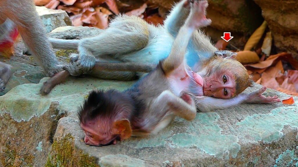 In the heart of the Angkor jungle, where ancient trees whisper secrets of the past, a curious little baby monkey was caught in the cutest act! With tiny hands reaching out and big eyes filled with wonder, the newborn seemed to be exploring more than just his surroundings—he was hunting for something special: milk!