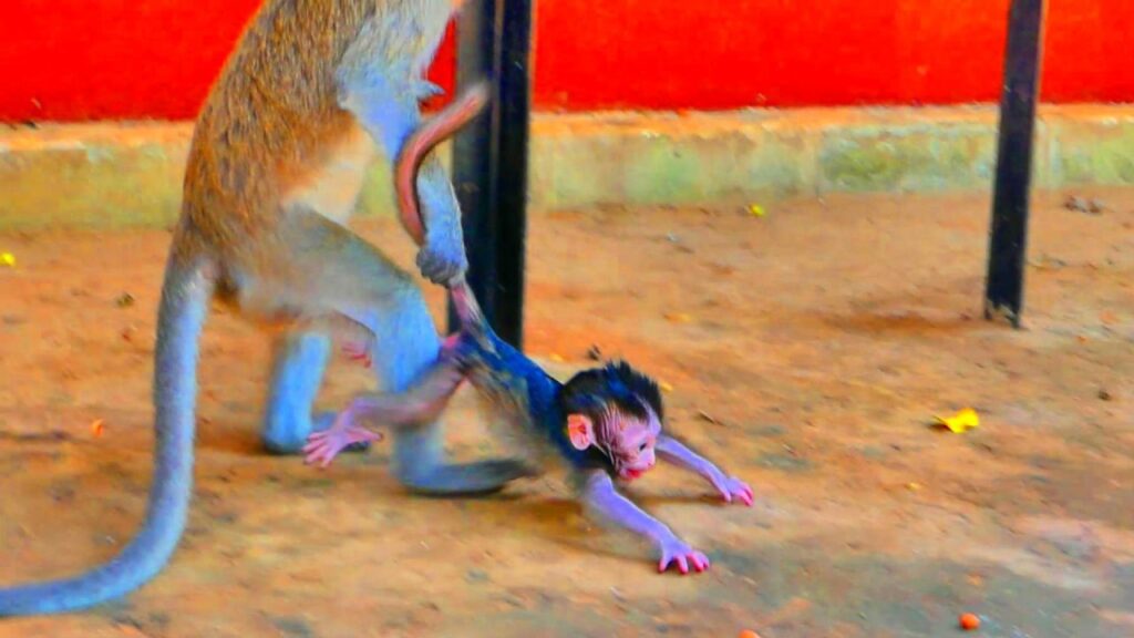 From a nearby tree, a very young monkey suddenly jumped down. This little troublemaker was known for being restless and curious, but no one expected such unbelievable behavior. Without warning, the young robber tried to grab the newborn baby. The mother was shocked and cried loudly, trying to protect her child. Other monkeys in the area began to watch nervously as the young monkey attempted to drag the baby away.