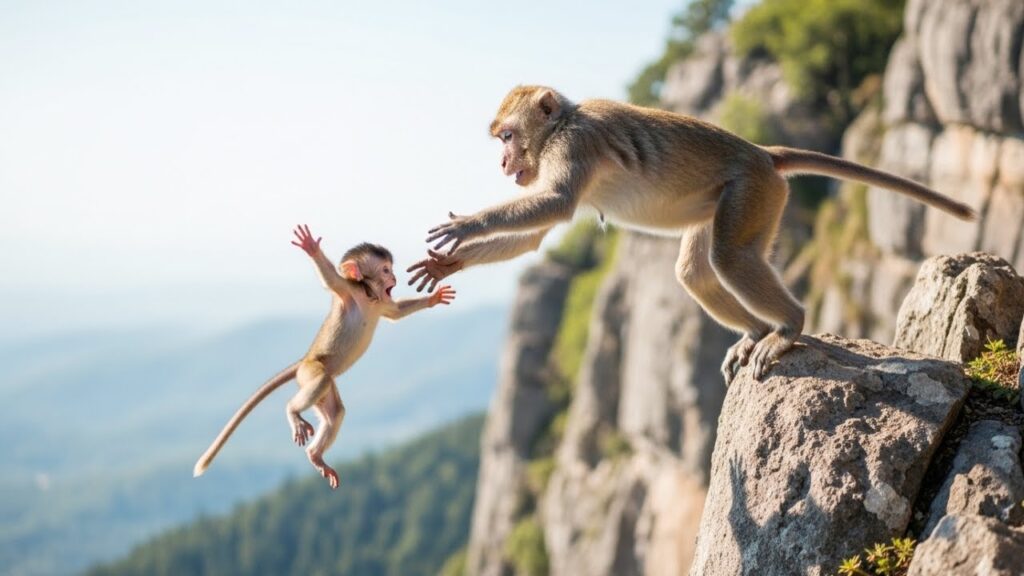 The forest valley was normally peaceful at dawn, but on this morning it trembled with the roar of a swollen river. Heavy rains overnight had turned the gentle stream into a fierce, rushing force. A troop of macaques gathered nervously along the cliffs, searching for a safe way across. Among them was a young mother, Lani, holding her tiny baby, Tiko, tightly against her chest.