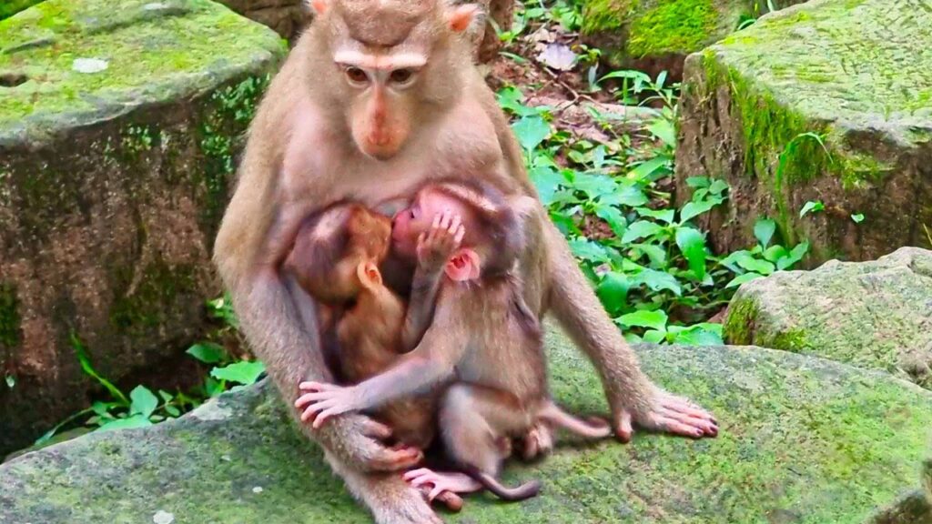 In a peaceful corner of the monkey troop’s territory, something quite fascinating is happening. Mom Katrina, a strong and experienced mother monkey, is performing a task that amazes everyone watching—she’s feeding not just one, but two baby monkeys at the same time! Little Jacee and sweet Kendra, both clinging tightly to Katrina, take turns suckling milk as their mother stays calm and focused, making sure both get enough nourishment.