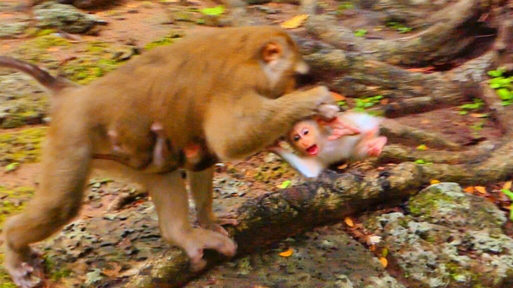 The gentle afternoon in the monkey troop was suddenly filled with tension and confusion. Little Jacee, the tiny baby with round, innocent eyes, found himself in an unfamiliar and heartbreaking situation. His own mother, Joyce, had wandered away without notice, leaving Jacee sitting alone, glancing around desperately for her warm embrace.