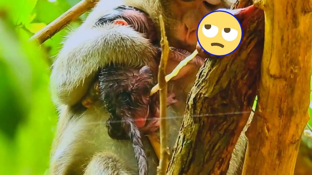 In the quiet morning light, deep in the jungle, a miracle unfolds—new life has arrived. A mother monkey, still panting from the effort, gently cradles her just-born baby. Her eyes, wide and alert, scan the surroundings. Though exhausted, her instincts surge into full action.