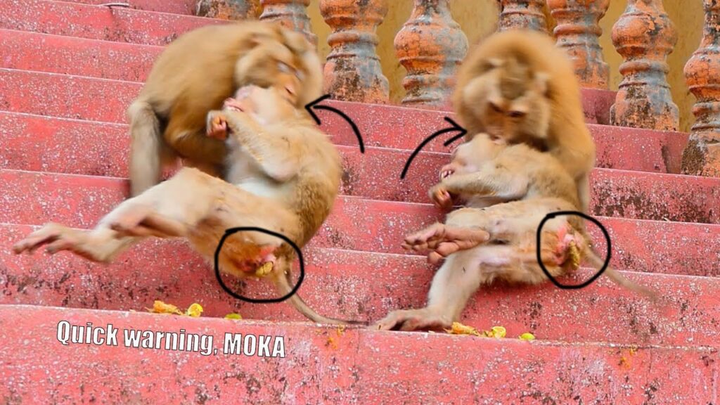 Under the warm sunlight of the temple stairs, little baby monkey MOKA was playing happily, jumping and climbing with innocent joy. But suddenly, his mischief went too far. He grabbed onto Mama SASHA’s tail and tried to b-i-t-e playfully, not knowing how rough he was being. Mama SASHA, startled by his behavior, turned around with a sharp warning. Her eyes showed both anger and deep concern, the way only a mother’s heart could hold both feelings at once.