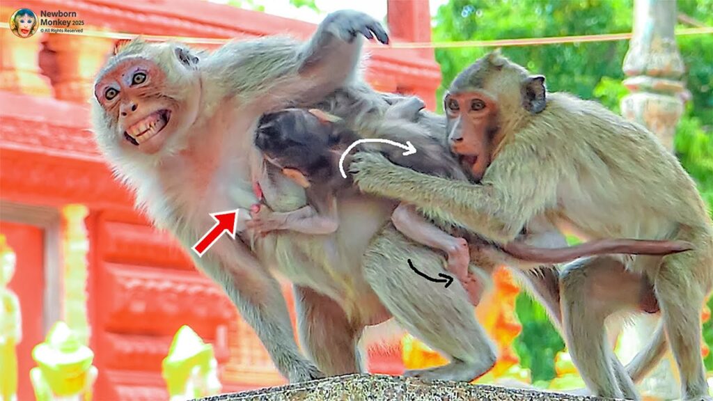 A tense and emotional moment unfolded deep in the jungle when Mama Sara found herself in a desperate fight to protect her baby, little Sam. The peaceful afternoon took a shocking turn when another female monkey from the group suddenly approached, showing too much interest in baby Sam. What started as curiosity quickly turned into aggression as the intruding monkey tried to snatch the newborn right from his mother’s arms.