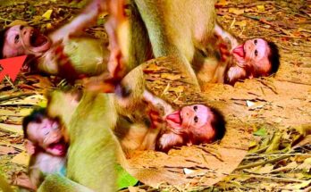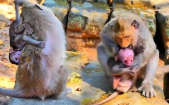 Mara, still overwhelmed by the troop’s tension, grabbed him again, this time too firmly. Though she didn’t mean to truly harm him, her agitation made her movements hard and frightening. Leno curled up, shaking, his tiny hands reaching out for comfort he couldn’t find. The older females nearby watched anxiously, sensing the distress.