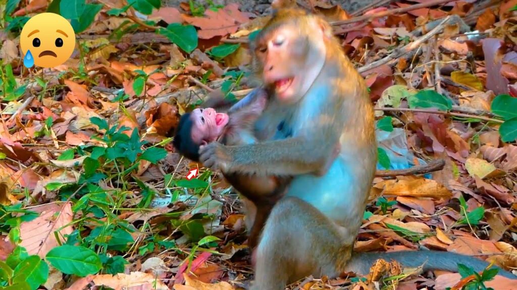 In the heart of the monkey troop, a touching yet heartbreaking moment unfolded when a tiny baby monkey, still fragile and innocent, tried desperately to ask his mother for more milk. His little hands reached out, his face full of hope, and his small cries echoed with need. But instead of warmth and comfort, the mother monkey put her t-e.m.per s-t.r.ictly on display, showing no mercy to her pleading baby.