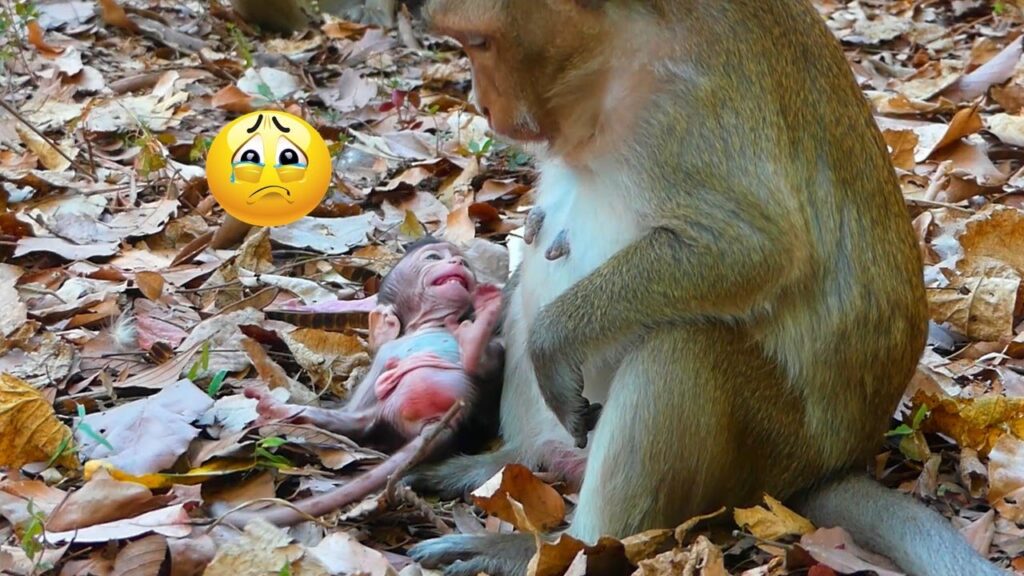 In the quiet corner of the forest, a heartbreaking scene unfolded. A tiny baby monkey, just a few weeks old, cried softly with hunger in his eyes. His little hands reached out, trembling, trying to cling to his mother, hoping for the comfort and nourishment of her milk. But sadly, the mother seemed distant, uninterested in his cries. She gently pushed him away each time he tried to nurse, leaving the poor baby confused and desperate.