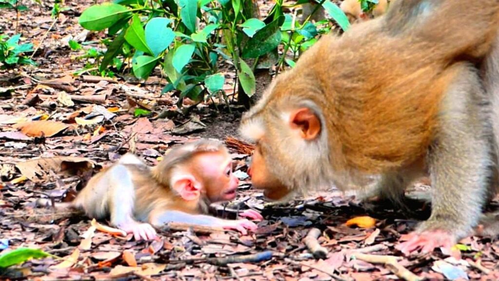 Joyce, experienced and calm, is simply following instinct—preparing her baby to become more independent. She encourages Jacee to explore solid food, nudging him gently toward small fruits and leaves. But to Jacee, nothing compares to mommy’s milk. He chases her through the trees, whimpers softly, and stretches his tiny hands toward her chest, clearly not ready to move on.
