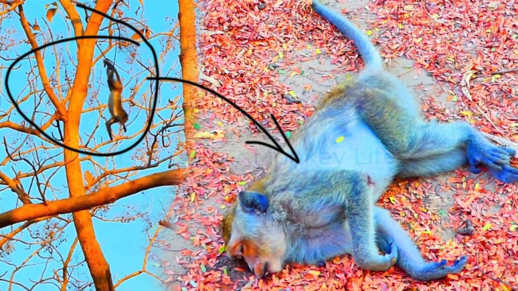 In the quiet forest, where the trees swayed gently with the wind, a heartbreaking scene unfolded that left many who witnessed it in deep sorrow. A pregnant monkey, heavy with life inside her, was carefully making her way along the branches. Each step seemed cautious, yet fate played a cruel trick. Suddenly, her foot slipped, and she tumbled down from the tree. The fall was not too high, but for a mother-to-be, it was frightening and painful.