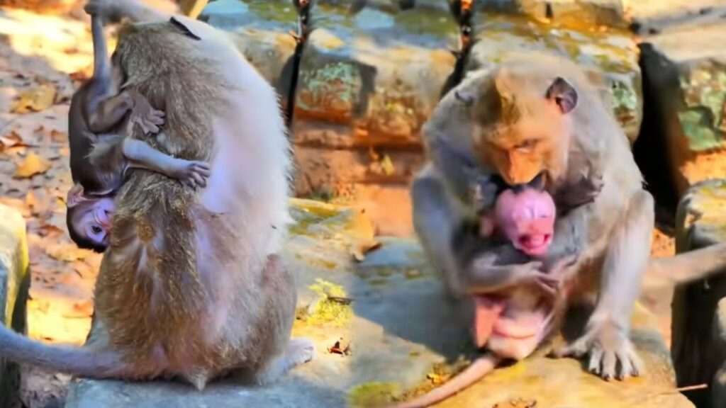 In the warm morning light, the troop settled along the edge of the forest, grooming one another and searching for breakfast. Among them was a young mother monkey named Mira, carrying her playful baby, Leno, tightly against her chest. But today, something unusual bothered her—something tiny, strange, and annoyingly sticky. A little piece of tape had somehow gotten stuck on her side, clinging stubbornly to her fur.