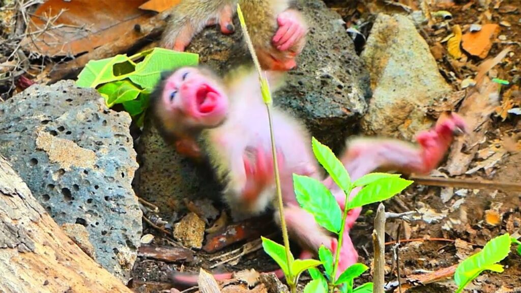 The little forest clearing was quiet except for the soft morning breeze rustling through the leaves. In the center of that peaceful scene, a tiny newborn monkey—still fluffy, still uncertain of his own legs—clung to the ground with trembling fingers. His tiny face scrunched with worry as he let out a small, high-pitched call, almost like he was asking for help. Everything in the world was still so new, and even the idea of standing felt too big for him to handle.