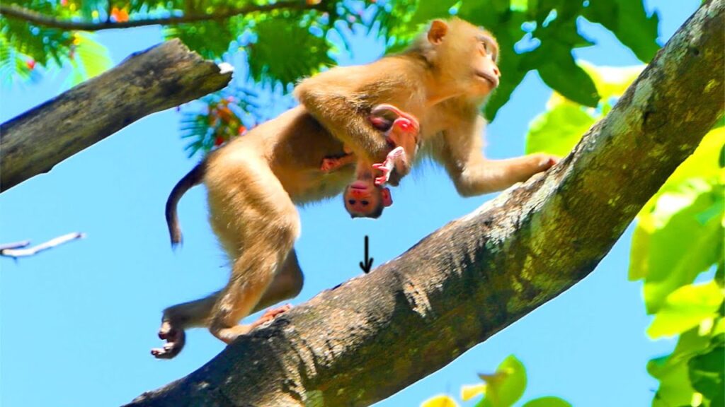 In a shocking and heart-pounding moment, young mother monkey Alissa was seen holding her fragile newborn baby with only one hand while trying to balance on a narrow, high tree branch. It was her very first baby, and clearly, Alissa was still learning the instincts of motherhood. The tiny newborn clung helplessly to her chest, its tiny limbs trembling, barely able to hold on.