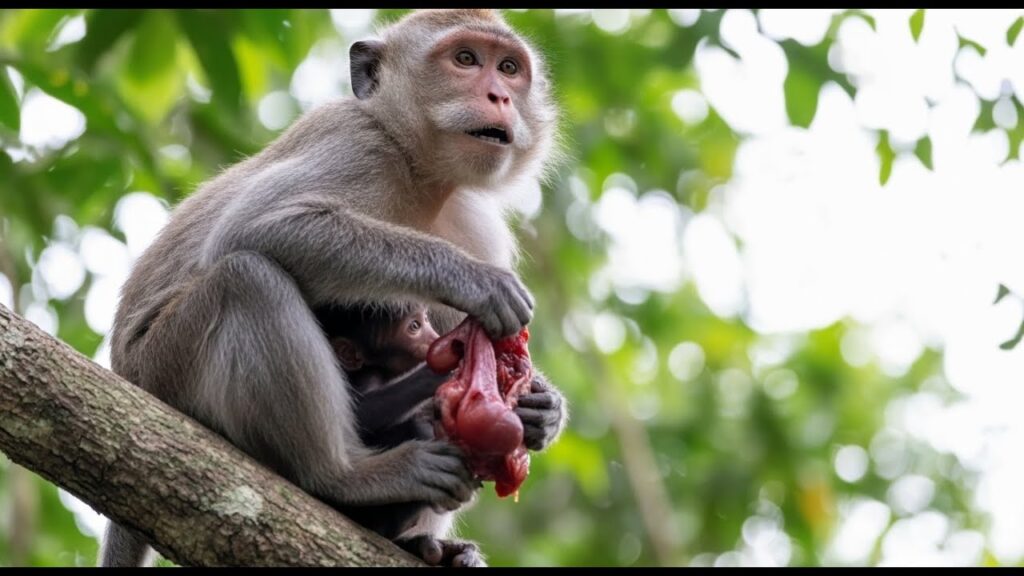 It was a moment both breathtaking and emotional, one that few people ever get the chance to witness. A very young monkey, still tender in age, surprised everyone when she went into labor. Normally, the older, more experienced mothers are the ones seen carrying new lives into the world, but this young monkey faced the challenge with remarkable courage. Her small body trembled as she tried to find a safe corner, away from the other troop members who watched curiously from a distance.